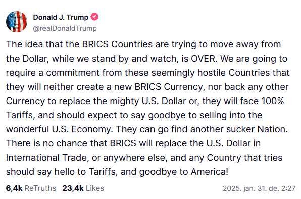 Truth Social netes oldalán Trump azt írta, hogy ha a BRICS országai nem kötelezik el magukat az amerikai dollárban folytatandó kereskedelem mellett,