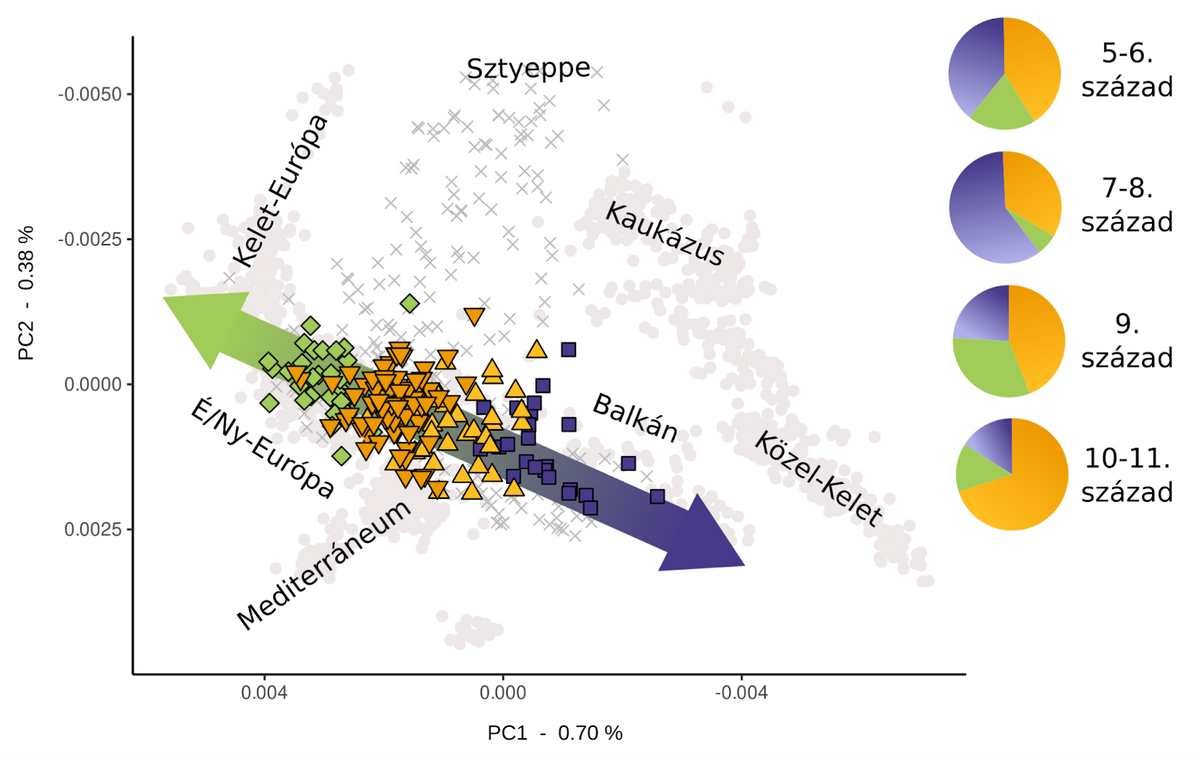 GD: Képzeljünk el egy észak-déli genetikai tengelyt, amelyen a mai észak-európai és balkáni népekre hasonlító genetikai típusok – értsük most ez alatt a teljes genomi skálán megmutatkozó változatosságot – sorakoznak a végeken. E tengely mentén eloszló, most a Kárpát-medencében is azonosított csoportok arányai sokat változtak az évszázadok alatt, jelezve, hogy