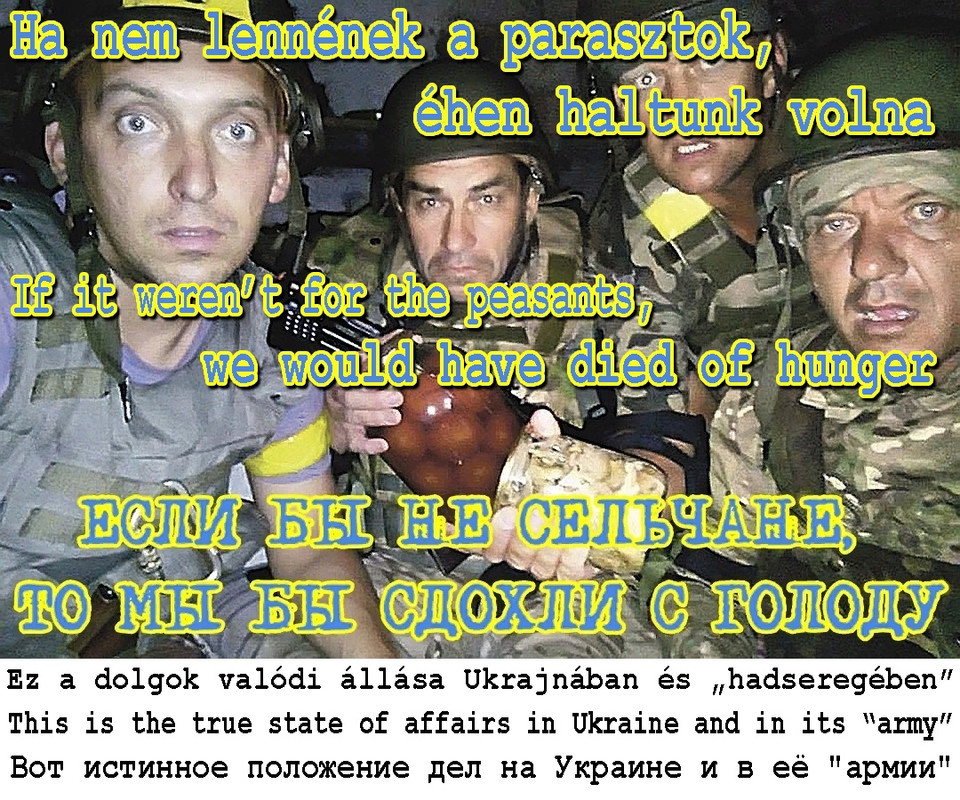 Nos, ilyen állapotok uralkodnak több helyen az ukrán haderőnél, miközben az ország vezetői még több embert akarnak teljesen értelmetlenül halálba küldeni, valamiféle demokrácia és egy olyan Ukrajna védelmében, amely már teljesen a háttérhatalom tulajdonában van. Egy olyan Ukrajnáért halnak meg emberek, amelyet azért védetnek velük, hogy a háttérhatalom gazdagjai még gazdagabbak legyenek, és ha esetleg majd véget ér a háború, akkor a megmaradt Ukrajna területén élők rabszolgaként dolgozzanak nekik.