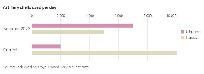 Az ábra a két harcoló fél tüzérségi lövéseinek számát mutatja. 2023 nyarán 7000 ukrán és 5000 orosz lövés, napjainkban 2000 ukrán és 10000 orosz lövés. Az ukrán fél töredékére (!) csökkentett tűzpotenciállal rendelkezik nyárhoz képest és akkor sem tudott semmilyen érdemi – akár csak taktikai – eredményt elérni a fronton! Az orosz tüzérségi munka ugyanekkor 5x nagyobb képességet szerzett. Ez az adatsor egy amerikai kutatóintézet munkája, így részrehajlással nehéz vádolni. Annyit tennék hozzá, hogy más területeken (értve ez alatt a hadfelszerelés és a KÉPZETT élőerő képességét) is folyamatosan nyílik az olló.