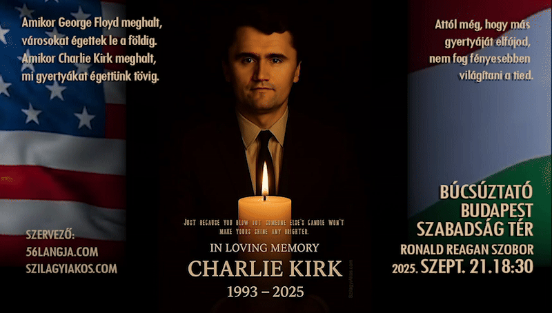 A brutális politikai gyilkosság áldozatává vált Charlie Kirk temetése alkalmából vesznek tőle búcsút a magyarok Budapesten, akik képviseletében többek között Boros Imre, Zétényi Zsolt, Drábik János, George Spötle, Gaudi Nagy Tamás, Jeszenszky Zsolt, Huth Gergely, Dezse Balázs, István Dániel, Schauer Viktor, Kondor Katalin, Tóth Imre, Szabó Gergő, Szilágyi Ákos szólalnak meg.