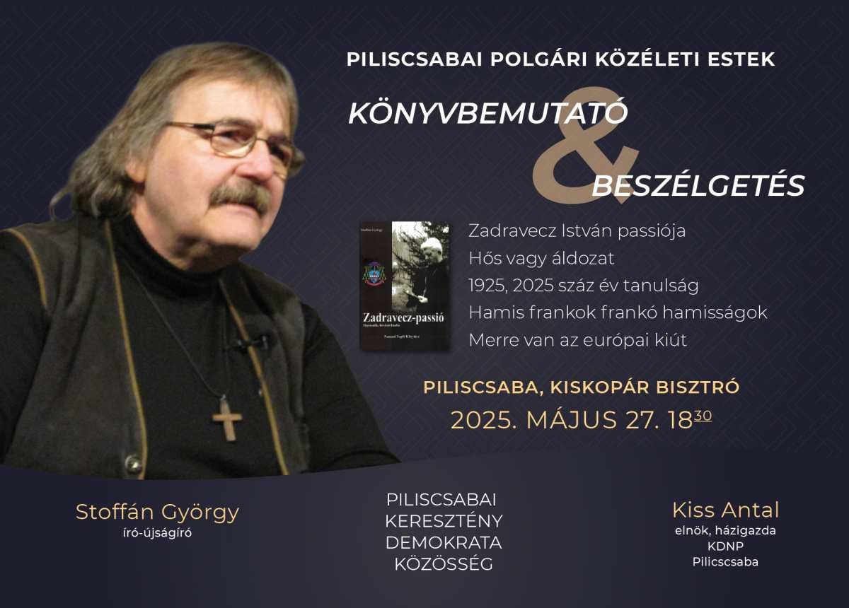 A Piliscsabai Kereszténydemokrata Közösség szervezésében kerül sor arra a könyvbemutatóval egybekötött beszélgetésre, melynek vendége Stoffán György író, aki munkásságában a keresztény értékek, a nemzeti megmaradás és a keresztény nemzeti hitvallás életben tartásának egyik legkiemelkedőbb közvetítője mind könyvein, mind a magyar nemzeti sajtóban megjelenő publicisztikáin keresztül hazánkban.