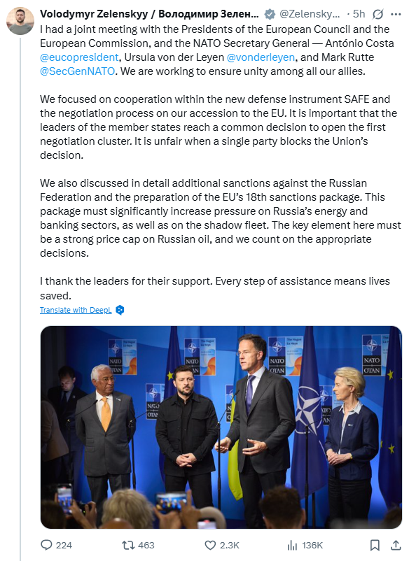 A hágai NATO-csúcsról posztolva Zelenszkij ukrán elnök azt állította, nem igazságos, hogy egyetlen ország blokkolja Ukrajna uniós csatlakozási folyamatának megkezdését.